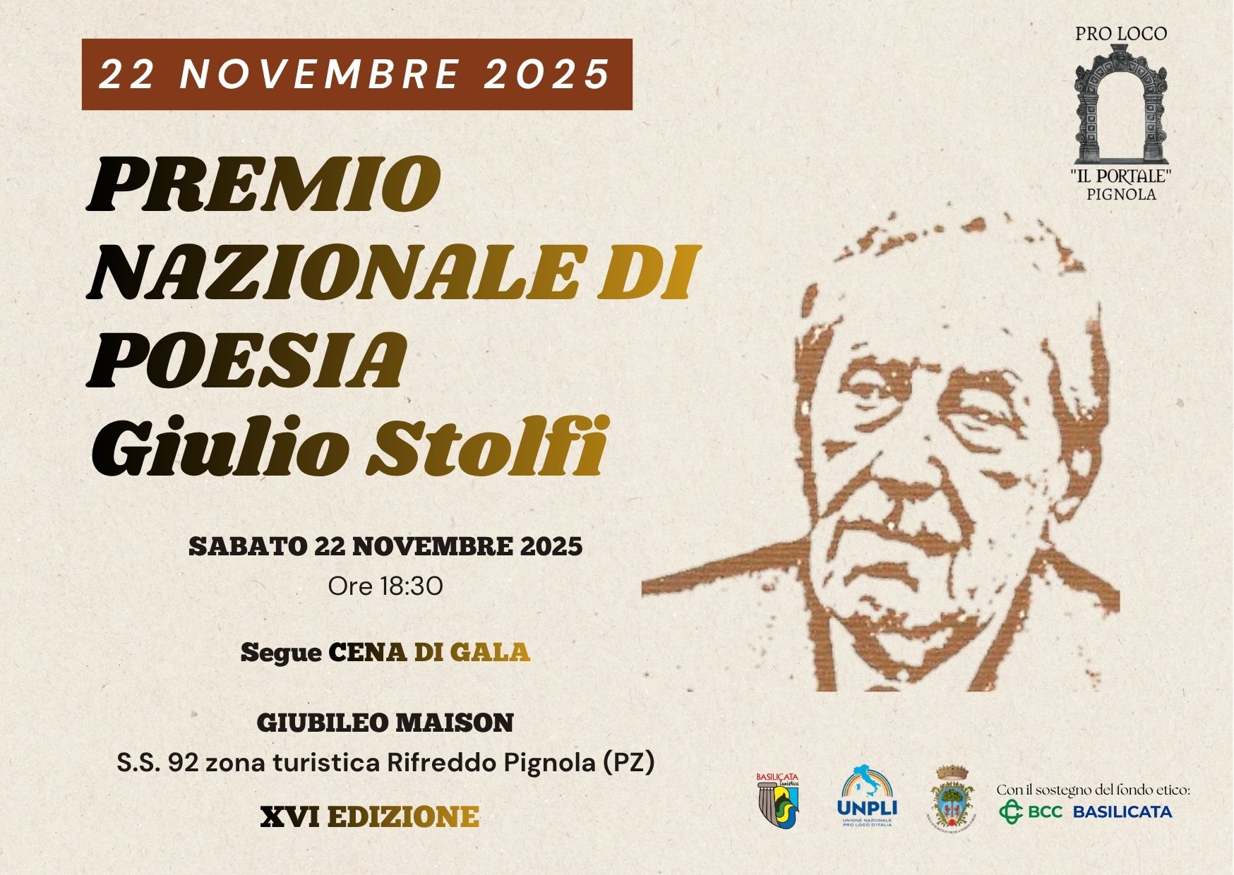 L’associazione culturale Pro Loco-Circolo Culturale “IL PORTALE” di Pignola, indice la XV edizione del Concorso Nazionale di Poesia intitolato alla memoria di “Giulio Stolfi” illustre Magistrato, Poeta e Scrittore.